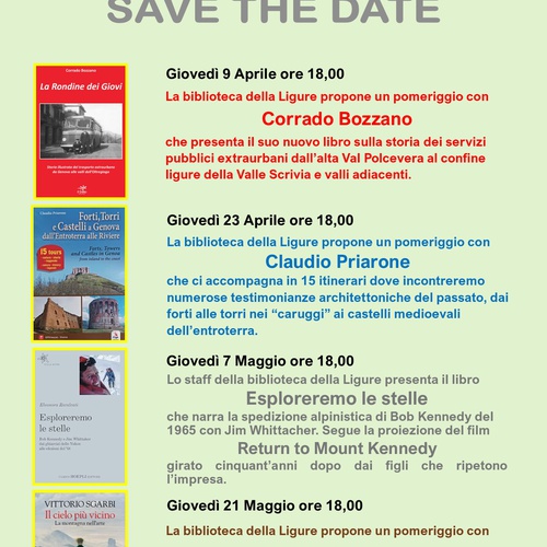 Vi proponiamo 4 incontri in Sede, in questi pomeriggi primaverili, con autori selezionati dalla nostra Biblioteca.